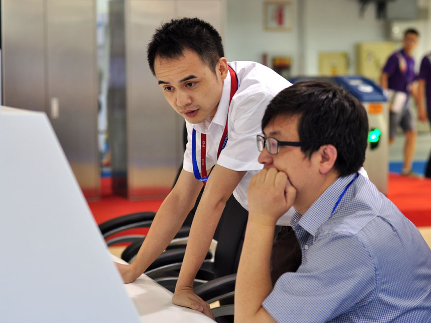 参观者仔细聆听技术人员讲解综合监控系统